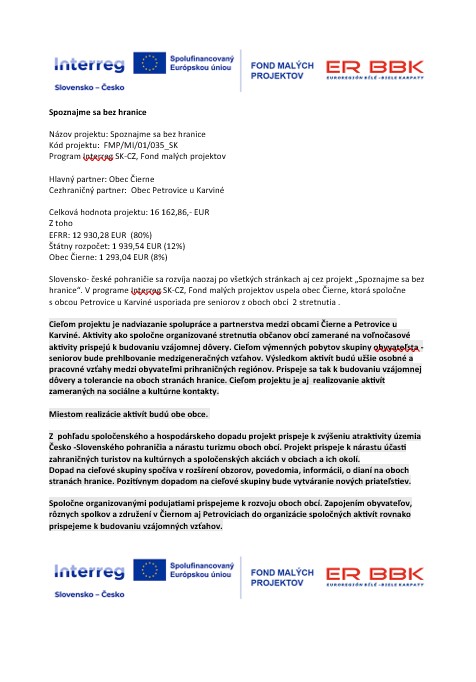 Slovensko- české pohraničie sa rozvíja naozaj po všetkých stránkach aj cez projekt „Spoznajme sa bez hranice“. V programe Interreg SK-CZ, Fond malých projektov uspela obec Čierne, ktorá spoločne s obcou Petrovice u Karviné usporiada pre seniorov z oboch obcí 2 stretnutia .