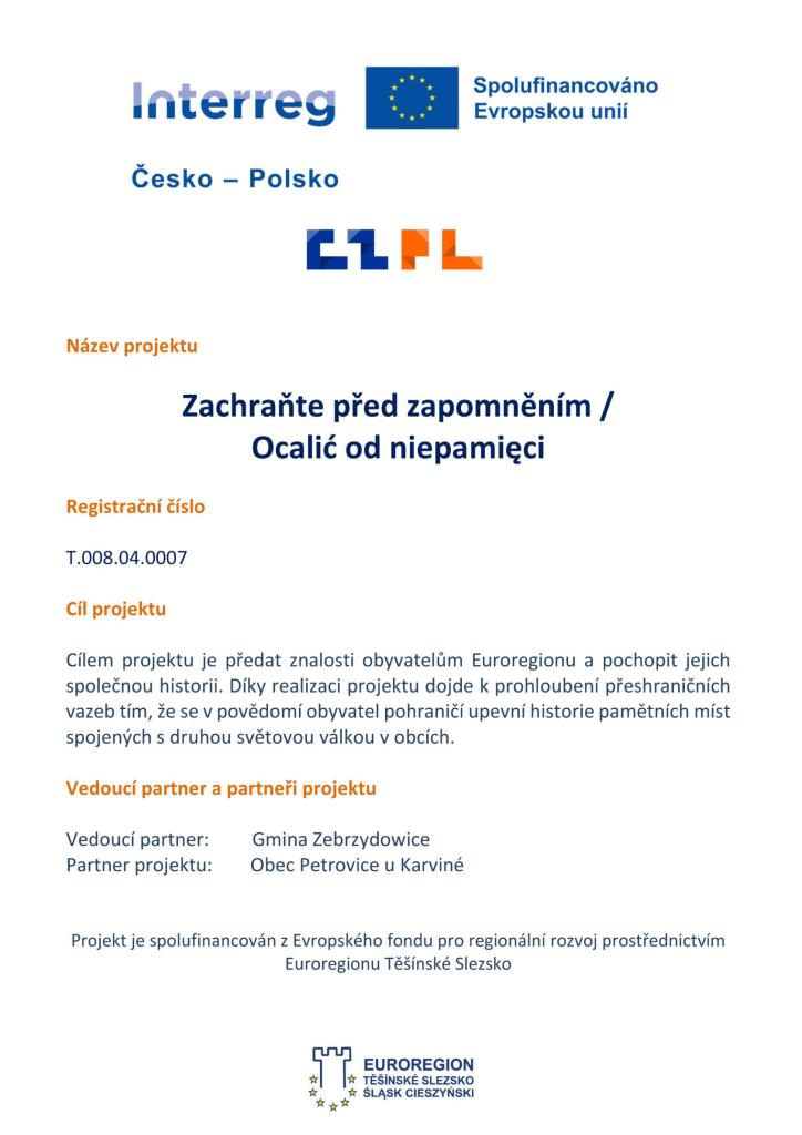 Stručný popis projektu: Druhá světová válka měla významný dopad na obce Petrovice u Karviné a Zebrzydowice. Partnery projektu spojují historické události související s tímto obdobím. Na území obou obcí existovaly tábory nucených prací. Projekt připomínající tyto události si klade za cíl posílit povědomí obyvatel Euroregionu o jejich společné minulosti. Realizací tohoto projektu dojde nejen k prohloubení přeshraničních vztahů mezi obcemi, ale také k posílení paměti historických míst souvisejících s 2. světovou válkou v obou oblastech. Zvláštní pozornost bude věnována německému nacistickému táboru nucených prací pro Židy v Zebrzydowicích a táboru Polenlager 41 v Prstné., který se nachází v obci Petrovice u Karviné. Tento projekt tak vytváří jedinečnou příležitost nejen k připomenutí si obětí války, ale také k posílení soudržnosti a vzájemného porozumění mezi obyvateli příhraničních oblastí sdílením a připomenutím společných historických událostí, které formovaly jejich současnou identitu.