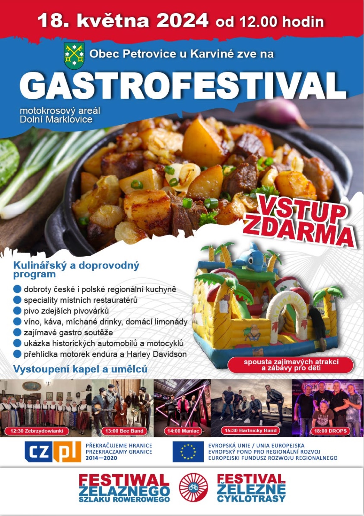 ... Gastrofestivalu, který startuje v 12:00 v areálu moto krosové kotliny. Můžete se těšit na živou hudbu od kapel jako je swingová Bee Band a energická dancerocková skupina Maniac. Pro milovníky dobrého jídla bude připravena bohatá nabídka lokálních i mezinárodních specialit – od tradičních českých jídel až po exotické pochoutky. Neděle přinese Gastrohrátky v Café Rotigel, kde na vás čekají další gastronomické zážitky.